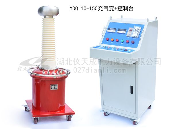 把电源输入有过流自动脱扣及防止突发加压的零位连锁装置的操作箱,经自耦调压器调节电压输入YDQ充气式试验变压器初级绕组,根据电磁感应原理,在次级(高压)绕组按其与初级绕组匝数之比可获得同等倍数的电压幅值-工频高压。