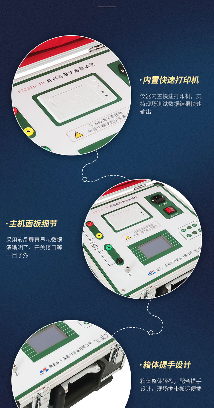 YTC316-10直流电阻测试仪采用电源技术,具有测量迅速、体积小巧、使用方便、测量精度高等特点,是测量变压器绕组以及大功率电感设备直流电阻的设备。