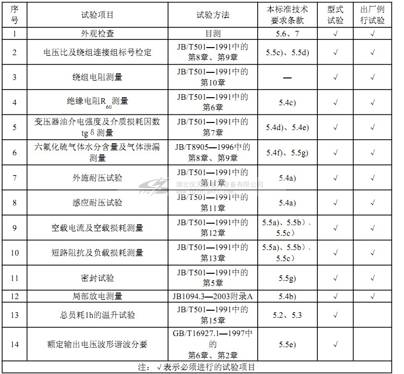 表6 无局放试验变压器试验项目和技术要求